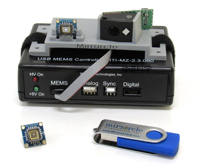 控制器。本公司设计的控制电路版提供USB通信连接, 16位驱动给微镜装置,与及可编排的硬件过滤, 可避开超调和振波。同时也包括一个数字输出口, 提供8数位线与微镜装置同步。控制器於每秒10万采样率驱动X同Y轴, 及数字输出口。内存提供达2万5千样本。控制器从USB取电, 可供电给内置微镜驱动器 (请参考以下)。所以一部手提电脑的电池可供电给整个系统。电路版的介面及控制是由 Windows API的C++功能、Matlab API、或LabView 功能(相关应用例子包含在 Mirrorcle软件套件内)。