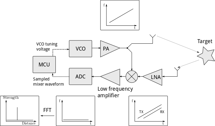 Radar transmits a chirp, which increases linearly with the frequency. This chirp is then radiated with the antenna, it reflects from the target and is received by the receiving antenna. On the reception side received and undelayed copy transmitted chirps go to the mixer. Because received chirp reflected from the target, but copy of the transmitted chirp is undelayed there is delay between the signals. This causes mixer output to have a low frequency signal which frequency depends on the distance to the target. When there are several targets the output signal is sum of different frequencies and the distances to the targets can be recovered with Fourier transform.