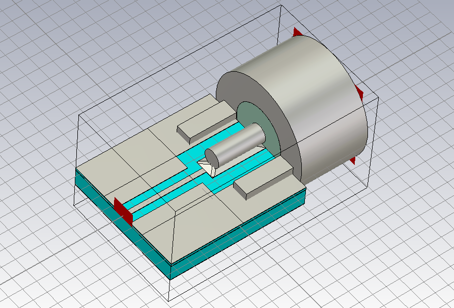 Power divider modeled in CST. Blue cylinder is 100 ohm resistor and red planes are waveguide ports.