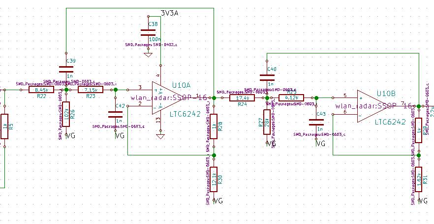 Because signal is going to be sampled by the ADC, filtering is needed to ensure that highest frequency of the signal is less than half of the sampling frequency, so that aliasing doesn't occur. Filter itself is the same as the one used on the MIT coffee can radar. Cutoff frequency is 15 kHz, but it could have been higher since the microcontroller can sample at least at 200 kHz. In practice it doesn't matter since range of the radar is not enough to generate a 15 kHz signal.