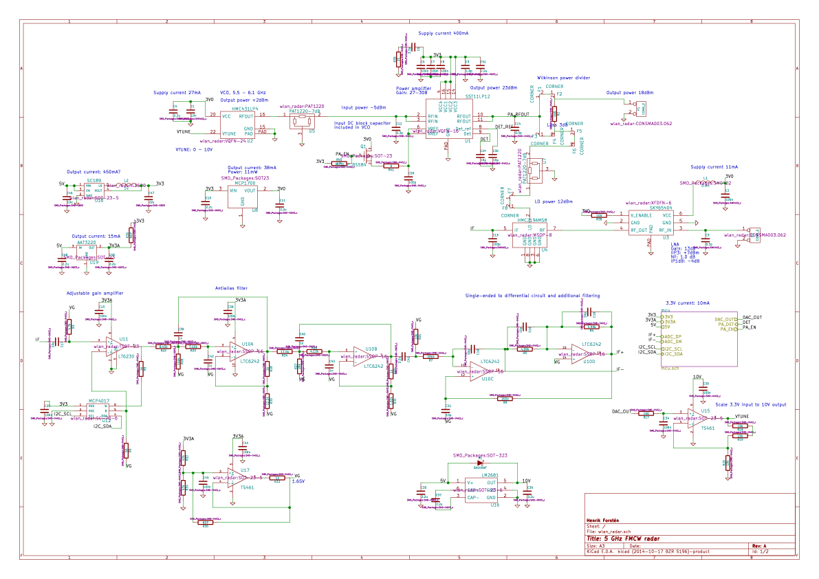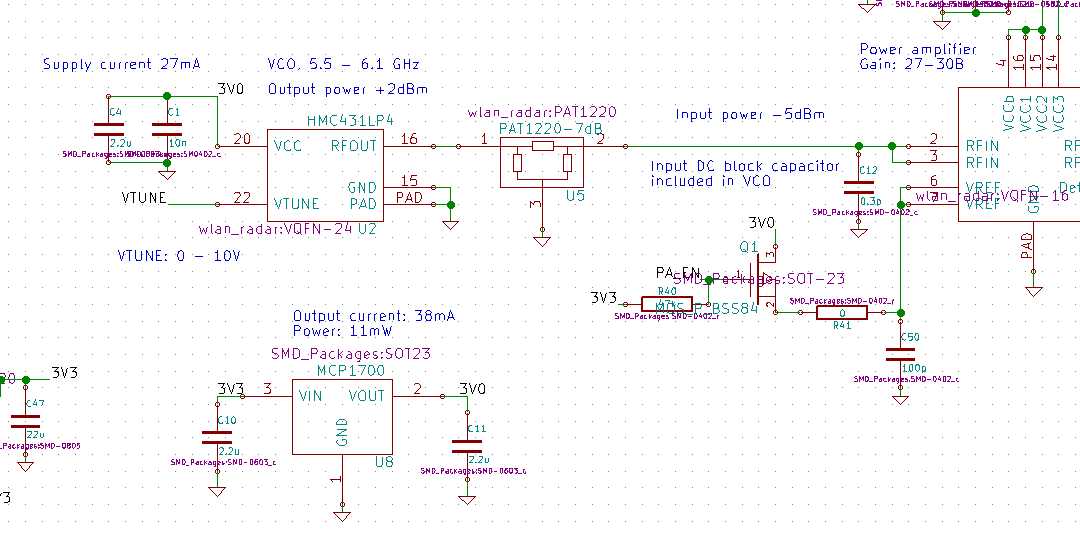 The reason I chose to use 5 – 6 GHz band was because there is a band reserved for radars around 5.8 GHz and this range overlaps with 5 GHz WLAN. Since wifi components are very common, there are many different cheap choices for the power amplifier. PA I chose to use is SST11LP12 which is a cheap WLAN PA costing 1.5€. There would haven been cheaper PAs, but their datasheets were so short on the details that I didn't dare to use them.