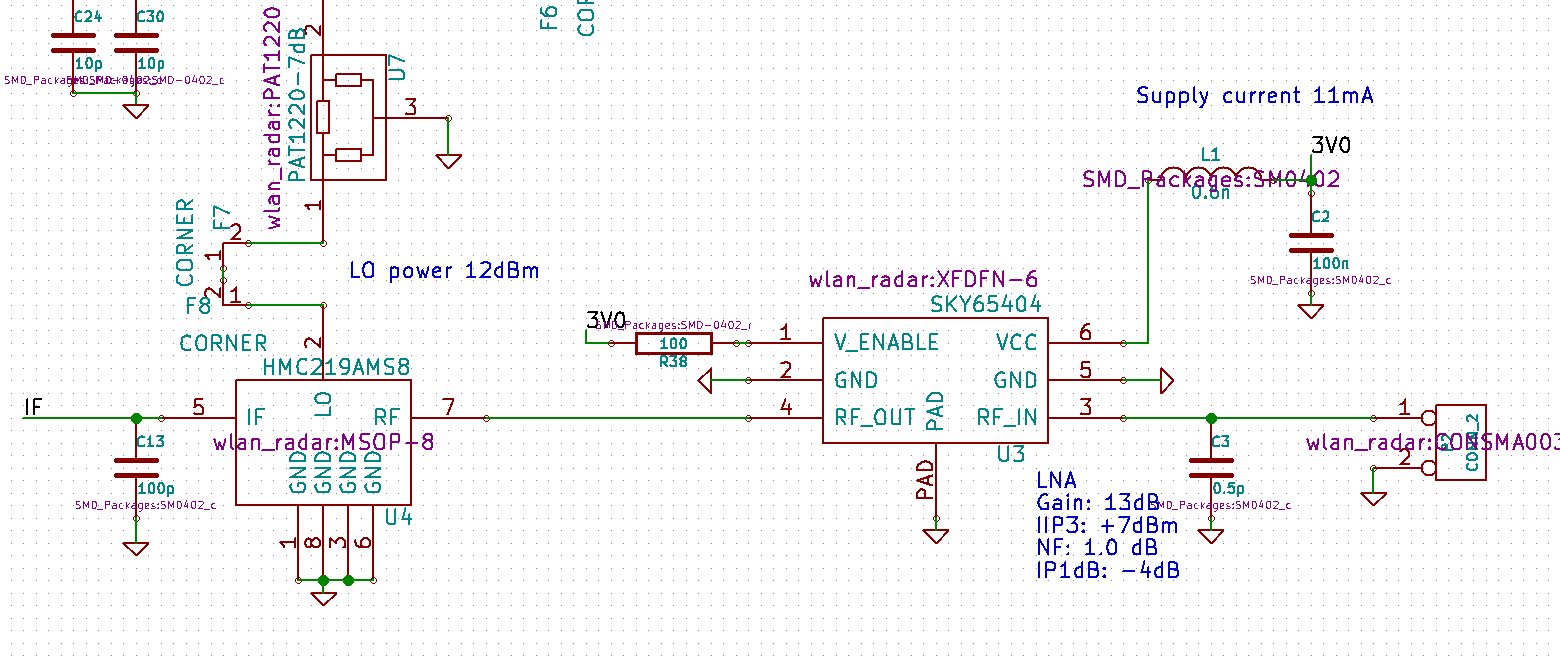 Radiated power is reflected from the target, captured by the receiving antenna, amplified by the low noise amplifier and then mixed with the PA output signal. LNA is also meant for the 5 GHz WLAN. It has a very low noise figure while also being incredibly cheap costing only 1.1€ at small quantities.