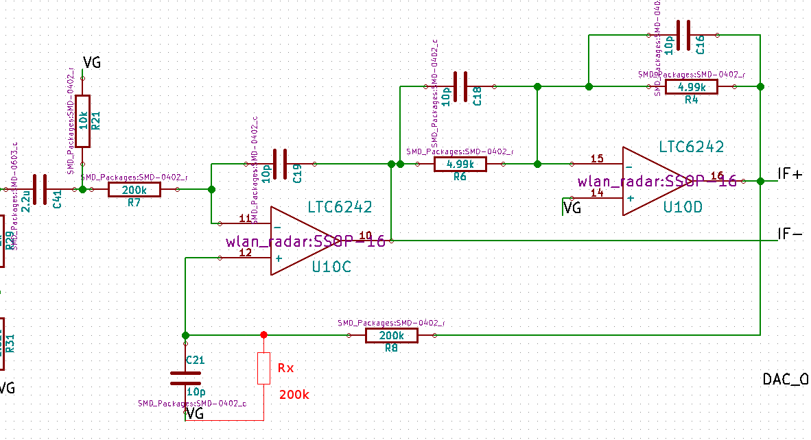 After the mixer output signal has a very small amplitude in about microvolt range and must be first amplified before filtering can be done. First amplifier uses LT6230 low noise op-amp in a non-inverting amplifier connection. MCP4017 is a I2C controlled variable resistor and varying it's resistance varies the gain of the amplifier. Gain is 1+R5+R(MCP4017)R91+R5+R(MCP4017)R9.