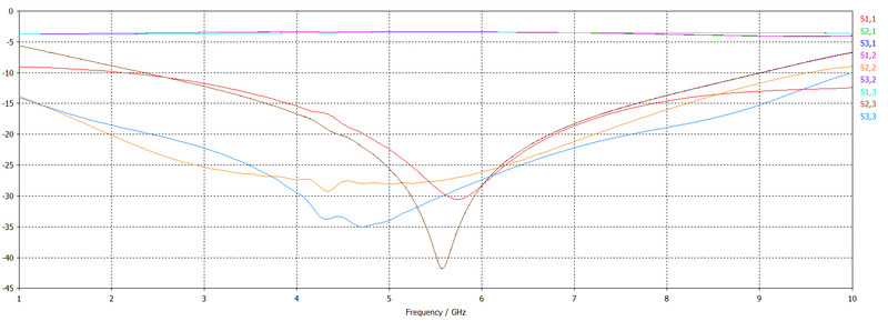 With the adjusted trace lengths port isolation is below -20 dB at all usable frequencies (5.3 GHz to 6.3 GHz).