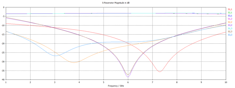 Divider was designed to have a center frequency of 5.5 GHz, but according to the CST it's working best at 6 GHz. Adding 1.2 mm more length shifts the working frequency to 5.5 GHz. I guess the difference is caused by the fact that I calculated the trace length from the branch to the center of resistor pad, but I believe length of the trace should be calculated from the branch to the center of the resistor.