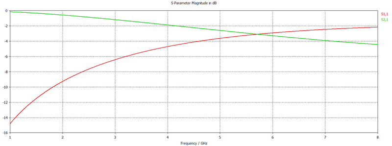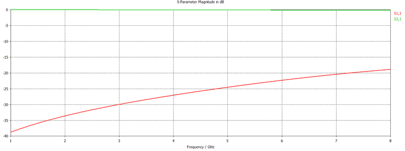From the low S11, -35 dB at best, it can be seen that the mitered bends are working and only a minimal amount of power is reflected back to the input. Though even with a straight 90 degree bends without miters reflections at these frequencies are most likely going to be minimal since wavelength of the signal is much bigger than the corners.