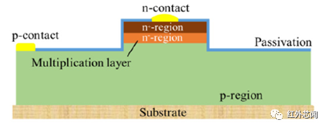 有两种工作模式的APD探测器件,分别是线性模式与盖革模式。它们的主要区别是工作电压大小。线性模式下的APD工作偏压低于雪崩电压,相当于一个具有增益的普通光电二极管。这种APD探测器要求材料的电子离化率和空穴离化率要有较大的差异,输出电流与入射光子数成线性关系,达到光子分辨的探测。而在盖革模式下器件工作在雪崩电压以上,形成的强电场使得进入耗尽区的每个载流子都可以触发雪崩效应,因此工作在盖革模式下的APD具有非常高的光增益,可以达到光子分辨探测的水平。这种模式下的APD相比PMT具有更高的探测效率,但是其暗计数比PMT要高。盖革模式下的雪崩发生后,会一直持续下去直到器件永久损坏,因此需要使用雪崩淬灭电路停止雪崩过程,并复位偏置电压。与PMT相比,半导体APD器件体积小,生产成本低,无需高真空工作条件,并且其制作工艺易于与后续电路集成,因此在大部分领域,APD较之于PMT都有更广泛的应用,例如近来提出的碲镉汞电子雪崩光电二极管,见图4。