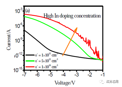 n+ -on-p台面结则易于实现异质结,可通过将pn结的表面高掺杂浓度区设计为高组分材料以实现组分异质结,可有助于抑制表面漏电和减小器件的隧道电流。这类器件的n区通常以In掺杂形成,P型层材料的选取则可为汞空位P型材料或者Cu掺杂P型材料。目前n+ -on-p台面结在工艺上面临比较大的挑战,问题出在热处理P型材料时,In的扩散会导致pn结