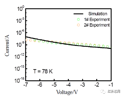 图9中展示了理论结果与中国科学院上海技术物理研究所的程雨顺、李浩等人提供的实验结果的对照,结果表明所建立的数值模型可以很好地与实验Ⅰ-Ⅴ特征曲线相匹配,从而验证了模型的准确性。