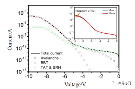 图6 碲镉汞雪崩探测器中的暗电流及其主要成分(附图为平面及台面结APD的Ⅰ-Ⅴ曲线)