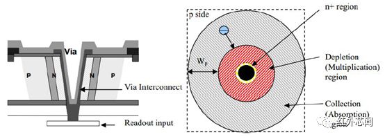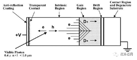 雪崩光电二极管是一种具有较高内增益和频率响应特性的器件,通常在PN结上加以重掺杂而形成。器件通常工作在较高的反偏压下,当入射光激发吸收层的光生载流子,在器件内部载流子与晶格碰撞离化会产生极强的雪崩倍增效应,可以将单个载流子产生的光电流放大至宏观上可被探测的程度,因此APD可用于单光子探测。APD的基本结构是工作于反向偏压下的PN结,当光子入射被吸收区域的电子吸收时会产生一个电子一空穴对,这一电子一空穴对在反偏压电场作用下分别向不同方向漂移从而形成光电流。比较普通的光电二极管,APD工作在较高的反向偏压下,形成了强电场加速光生载流子获得较高的能量,在与晶格发生碰撞后将使晶格中的原子发生电离产生新的电子一空穴对,这一碰撞电离过程与PMT的过程类似。这些新的电子一空穴对又可以在电场作用下获得动能形成新的碰撞电离过程,如此重复即可形成显著的雪崩效应,使APD中的载流子数目迅速增加,从而将入射的光信号不断放大,最终向读出电路输出较强的电信号。