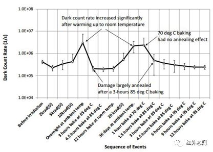 暗计数(Dark count rate):在没有入射光子的情况下,探测器自身也会产生一些非光子响应的输出信号,通常被称为暗计数。探测器的材料缺陷、偏置条件或外部噪声会导致误计数,因此,决定了暗计数的水平。汞空位掺杂碲镉汞APD暗计数与工艺的关系,如图2所示。针对半导体雪崩光子探测器,在隔离的实验室环境下暗计数的测量实际意义不大,必须将探测器集成到系统的应用环境下测量其暗计数,确保为真实应用时暗计数的大小。通常情况下,暗计数的数值单位表达方式有两种,一种表达为个/秒,也可表达为个/探测门。通过工作在门触发模式或设置淬灭时间,人们能实现有效减缓探测器的暗计数率。探测器的抖动时间决定了最小探测门宽或淬灭时间的间隔。