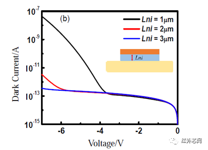 除了掺杂浓度以外,倍增区厚度的精确控制也是台面结碲镉汞APD工艺的一个难点。图13(b)所示即为台面结APD暗电流随倍增区厚度的变化特性,结果表明台面结APD的暗电流显著地受到倍增区厚度的影响,在-7V的反偏压下倍增区厚度增加1μm会导致暗电流的3~4个数量级的上升。
