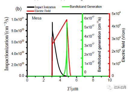 此外,进一步对反偏压在-7V下的平面及台面PIN APD的电场分布、BBT隧穿及碰撞电离特性进行了计算,计算结果如图7所示。值得注意的是平面结APD中倍增区的电场分布明显高于台面结。从图中可以看出,碲镉汞APD的BBT及碰撞电离特性与其电场分布特性密切相关,平面结APD中的BBT及碰撞电离较之于台面结要高4个数量级。