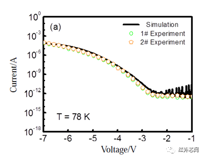 图12中展示了理论结果与中国科学院上海技术物理研究所的程雨顺、李浩等人提供的实验结果对照,结果表明所建立的数值模型可以很好地与实验Ⅰ-Ⅴ特征曲线相匹配,从而验证了模型的准确性。